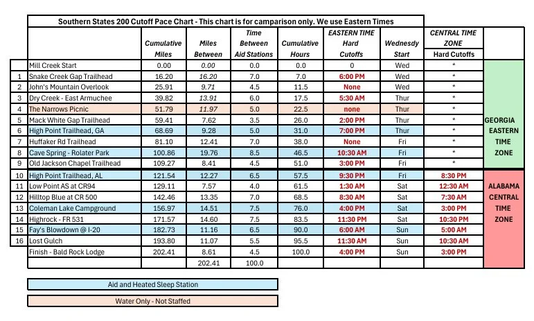 When your cross into Alabama (Between Old Jackson Chapel and High Point, AL, leave your timing device/watch/phone set to Eastern Time. Be sure your crew does the same. You may need to set the device NOT to automatically change when you cross time zones. Central is one hour earlier than Eastern.