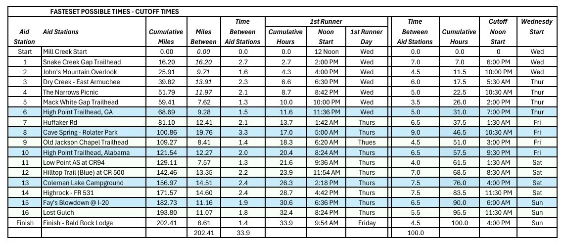 Fastest Possible Times and Cutoff Pace Chart