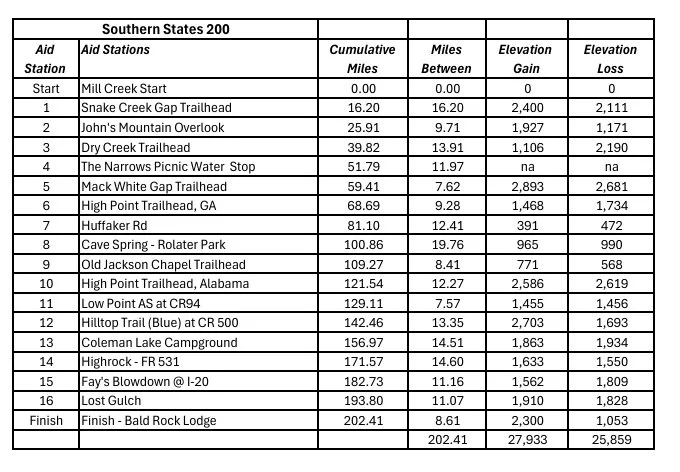 The Southern States 200 takes you on an epic point-to-point journey that few ultrarunners will ever experience. Starting at Mill Creek near Dalton, Georgia, you'll traverse 203.14 miles of diverse terrain, climbing 27,933 feet of elevation gain, before reaching the summit of Mount Cheaha—Alabama's highest point.