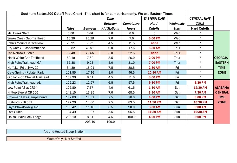Pace Chart - Fastest Possible Times and Aid Station Cutoff times