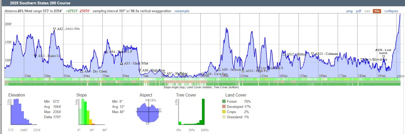 The Southern States 200 has 16 aid stations. The last 7 aid stations are in Alabama. We describe each of the Alabama sections on this page. We will provide runners with a detailed description of each trail section of the course, by aid stations. We will include feet of ascent and descent, type of trial and trail surfaces along each section, as well as a turn-by-urn description. This section may be updated from time to time. We will note the date of the latest updates